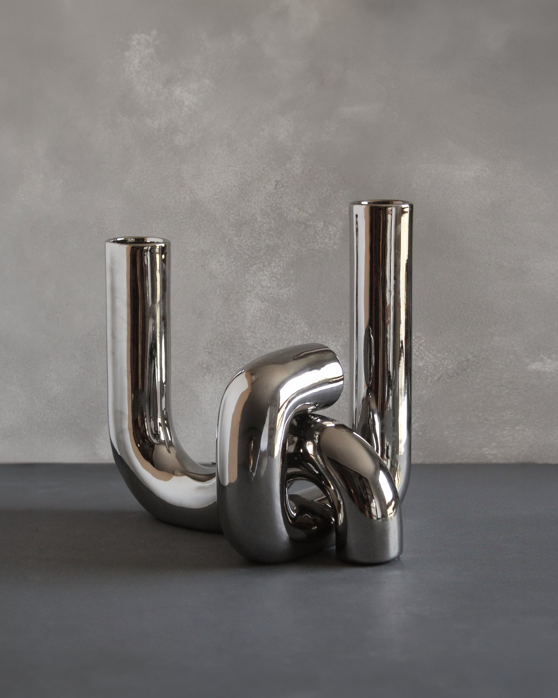 Florero de dos piezas en curva entrelazadas en color plateado. Unidades Totales: 2 |